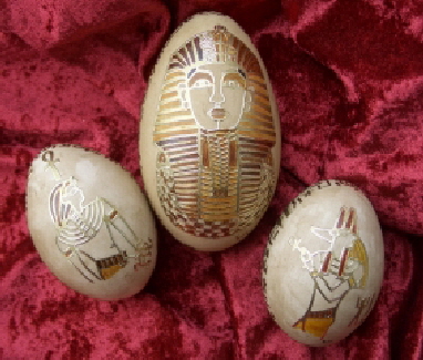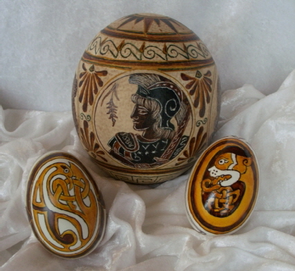Motive aus aller Welt inspierierten zu diesen Eierbemalungen. Die zarten Vögel und Kirschblüten aus der chinesischen Tuschemalerei, die antiken Gestalten und Ornamente der alten griechischen Kunst, die Götter und Pharaonen, ergänzt mit Hieroglyphen oder die verschlungenen Tierornamente aus der Keltischen Kultur machen diese Eier zu etwas ganz Besonderem. Bepflanzt man diese anschließend noch, entsteht ein echtes “Bonsai-Ei”.